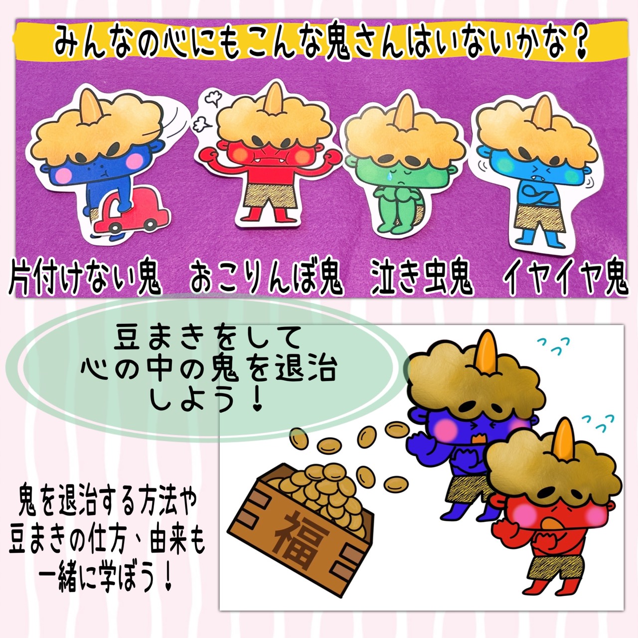 鬼さんの嫌いなものは何かな?など、 様々な「節分」に関する意味や由来について分かりやすく子供達に伝えることが出来ます。